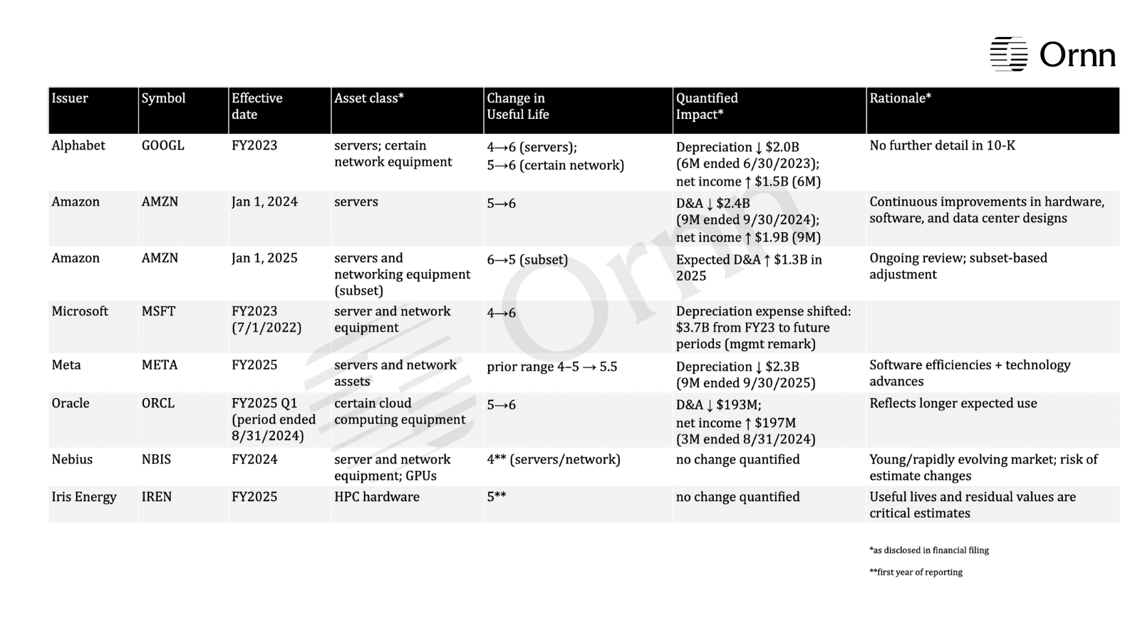 Across the issuer set, management rationales cluster around (i) software and operational efficiencies, and (ii) hardware/data center design improvements that purportedly extend service life. Quantified impacts are often disclosed when the change is material.